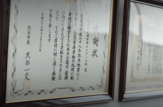 設立から30年、会社がある福岡県小郡市では約13年おきに大きな台風や豪雨災害に見舞われてきた。1991年(平成3年)の大型台風では60名以上の死亡者が出る事態となり、その時、小郡市内だけでも約500台の災害廃棄物を収集したと野﨑氏は語る。