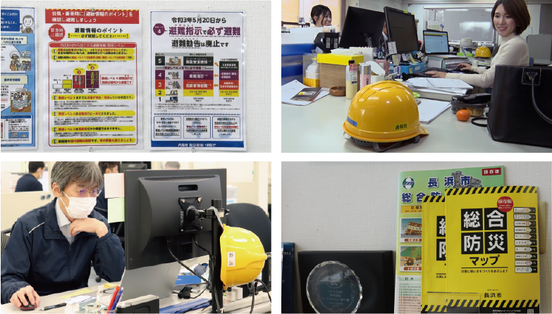 「ジギョケイにより、自然災害が発生したときの情報収集の方法や社内にどう周知するか、そしてどう対処するかをきちんと文書化していたことで、社内の意思の共有とスムーズな対応ができました。具体的には、万一に備えて配布している防災ヘルメットを各自が着用し、安否についてはLINEおよびLINE WORKSなどで確認、被害状況は連携各社で共有、避難が必要な場合は従業員入口に掲示した長浜市の『総合防災マップ』、当社が独自に作成した『避難誘導マップ』をもとに避難するというものです。今回は幸いにも社屋まで洪水が到達することはありませんでしたが、ジギョケイ策定の効果を大きく実感した出来事でした」(千葉氏)
