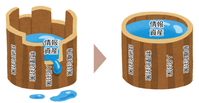 以上、4つの対策を簡単にお話ししましたが、これらの対策は相互に関連付けられるもので、各対策のレベルを同じ水準に揃えることがとても重要です。仮に高価で最新鋭の技術的対策を実施したとしても、それを利用する「人」から情報が漏れてしまったら意味ないですよね。逆に、「人」のセキュリティマインドを上げることで、高価な技術的対策は不要になるかも知れません。