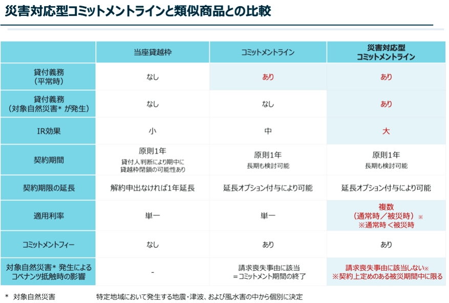 2つ目は、被災による利益・財務状況の悪化を事前に考慮した契約であるという点です。自然災害で被災した場合、企業の利益や財務は甚大なダメージを受けると想定されます。一般的なコミットメントラインでは、一定の利益水準、財務水準の維持を個別融資実行の前提条件としているため、被災をした場合、融資を受けられない可能性があります。しかし、「災害対応型コミットメントライン」では、事業に影響を与える災害が起きた場合、利益・財務水準の維持という前提条件は免除されます。