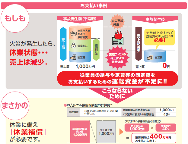 昨今、猛威を振るう新型コロナウイルス感染症による休業に対しても、保険金が受け取れます。具体的には、施設で感染者が発生し休業した場合の休業による売上高の減少のほか、施設の消毒費用やPCR検査の費用等も保険金の対象となります。