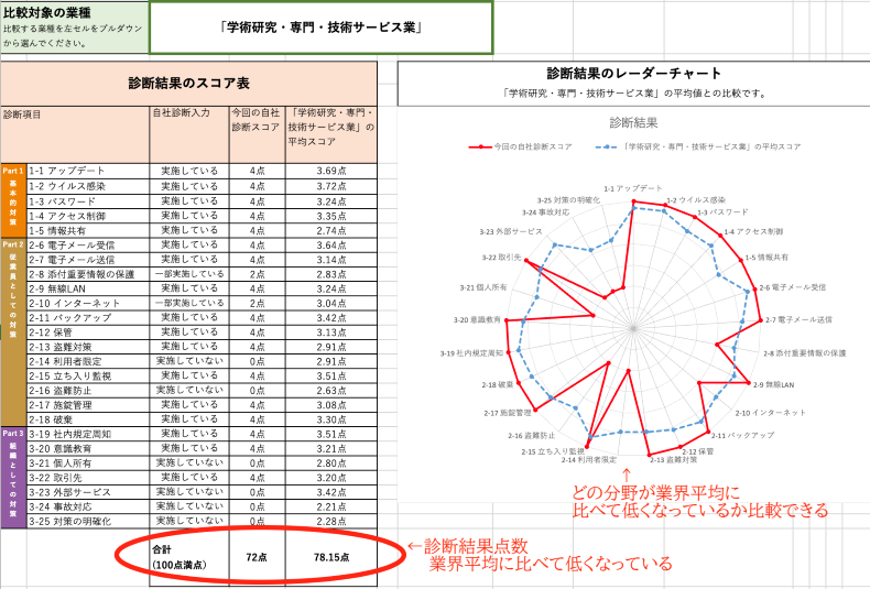 セキュリティ診断の結果は、点数として確認することができ、同業種と比較して自社のセキュリティ対策がどの程度取り組めているのかを把握することが可能です。