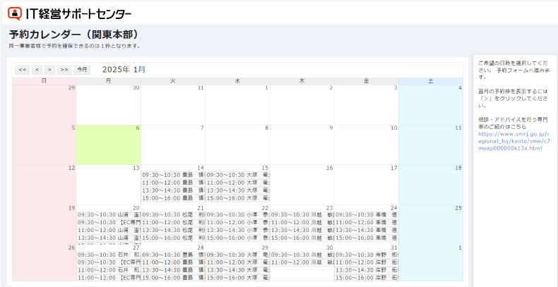 「ご予約はこちら」ボタンをクリックし、本社のある都道府県を選択後、表示されたURLをクリック。表示されたカレンダーからご希望の日時を選択し、貴社の情報やご相談内容をご記入頂けば相談の予約ができます。