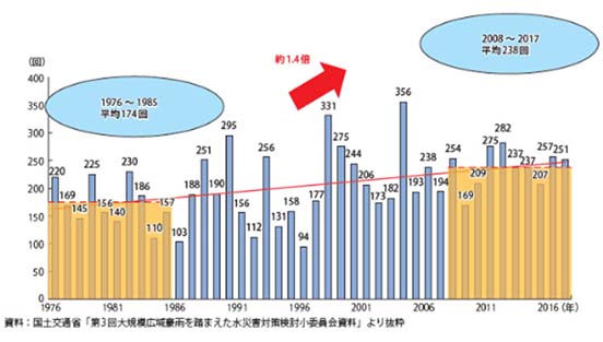 国土交通省の調べでは、下の図に示すように1976年からの10年に比較して、2010年からの10年は、短時間強雨の発生頻度が約1.4倍に増加しています。また、今世紀末までに洪水発生頻度は約2倍に増加すると予測されています。