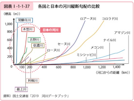 梅雨時期は日本列島に梅雨前線が停滞し、雨を降らせますが、この前線に向かってより暖かい空気が流れ込むことで大雨や長雨が発生します。さまざまな要因が重なると、ある場所で線状降水帯が発生し、同じ場所で長時間降雨が継続することがあります。雨水はダム等に貯水されますが,許容量を超えそうになると緊急放流(ダムの崩壊を防ぐために、やむなくダムの水を下流域に放出する)をせざるを得ず、下流域で洪水やはん濫が発生しやすくなります。下の図のように日本は地形が急峻なため、河川の水は上流から下流に短時間で流れるので、他国に比べても洪水,はん濫や土砂災害が起きやすいといわれています。