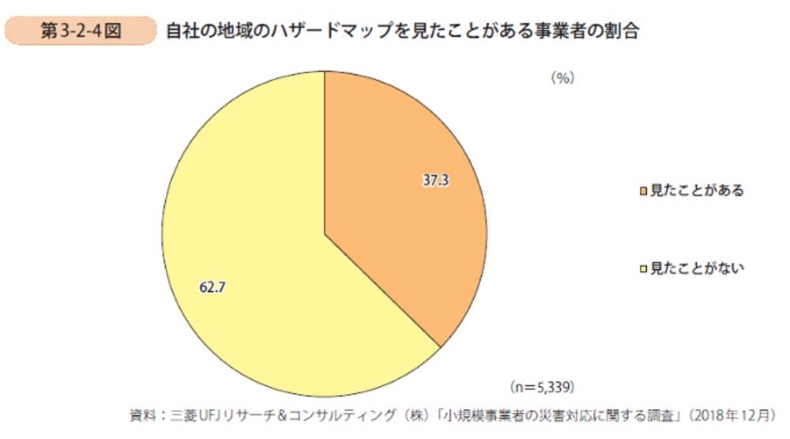 「小規模企業白書 2019」によると、自社の地域のハザードマップを見たことがある事業者の割合は4割に満たない状況です(下図)。梅雨前線や台風は場所を選ばず襲来します。事業者の皆様には、地域のハザードマップをご確認いただき,自社の風水害リスクを知り、従業員や家族の命、会社の財産を守るためにぜひ対策を検討していただきたいと思います。