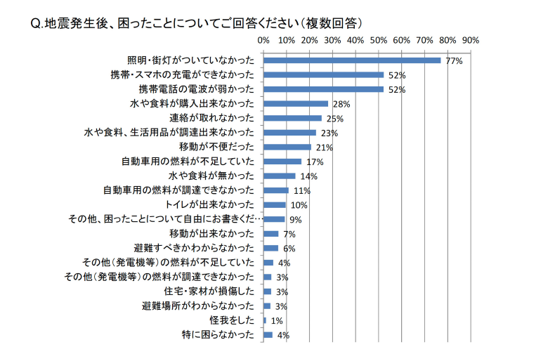地震発生後、困ったことについて調査したアンケートによると、電力(照明、スマートフォンの充電)が圧倒的に多く、次いで飲料や食料、車両の燃料、トイレといった項目が続く。ここからも明らかだが、企業としてまず電力を確保することが、防災・減災対策の第一歩だと考えていいだろう(出典:北海道開発局 交通情報報告 10.地震発生後困ったことより)