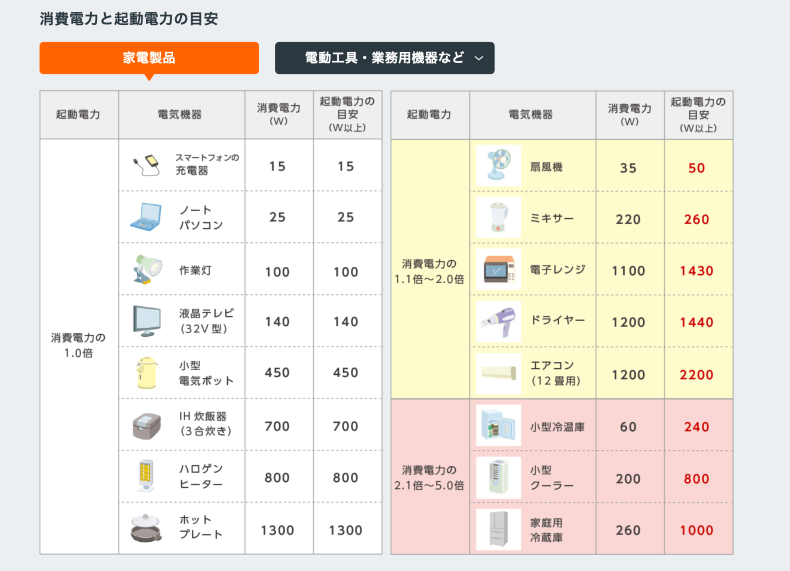 緊急時に必要な機器をリストアップしたら、そこから消費電力を算出します。電気機器の電力には通常の消費電力のほかに、起動の際一時的に増加する起動電力があります。エアコンや冷蔵庫、電子レンジなどモーターを搭載する機器はこの起動電力が消費電力の1.5倍〜4倍程度必要なものがあります。合計の消費電力を算出する際は、必ず起動電力にも注目するようにしましょう。