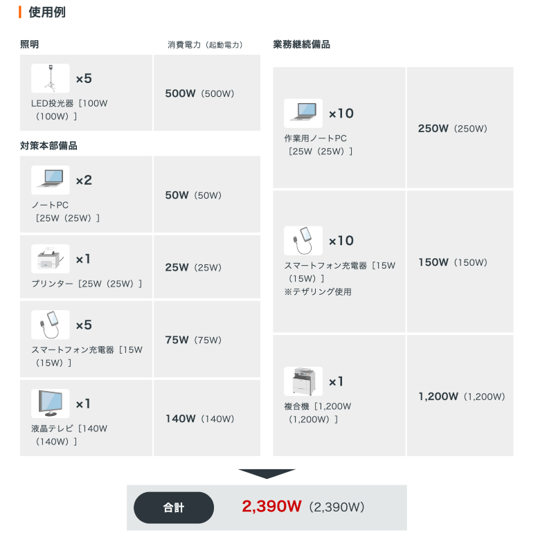 すべての機器を使用した際、どのくらいの消費電力が必要なのか事前に確認しておきたい