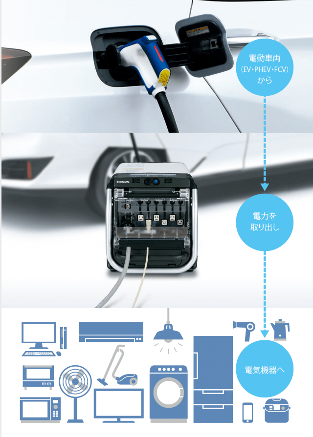 エンジンで稼働する発電機は、燃料(ガソリン)の管理、騒音への配慮、排気ガスの対策など、使用する場所や時間帯にどうしても制約があります。そこで、災害時の電力としてこのところ注目を集めているのが、プラグインハイブリッド車(PHEV)や電気自動車(EV)、燃料電池自動車(FCV)から電力を供給する方法です。