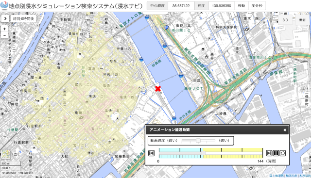 もし付近の河川の堤防が決壊すると、どの地域がいつどのくらい浸水するのかの変化を、アニメーションやグラフで見ることができる