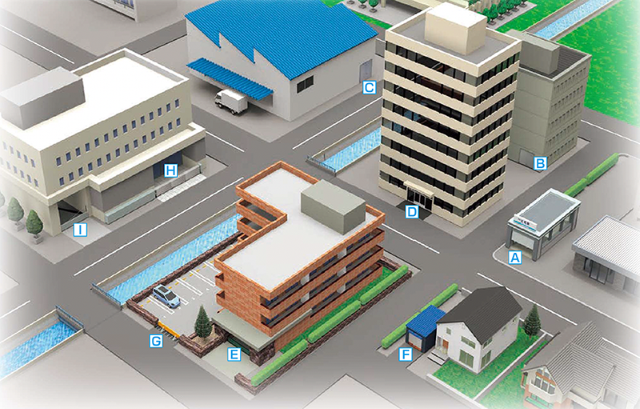 - 付近の河川が氾濫すると、ビルのエントランス(D,E)や通用口(C,B)、地下設備の入口(A,I)、ガレージ(F,H)といった場所に浸水の危険があるため、防水シャッターや防水ドア、止水板など自衛水防対策をする必要があるだろう