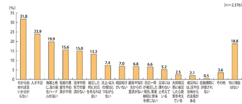 自然災害への備えに取り組んでいない理由としては、「何から始めれば良いか分からない」「人手不足」「複雑と感じ、取り組むハードルが高い」などとなっており、いざという時の資金需要を想定する状態にはなく、それ以前の段階にある企業が多そうです。