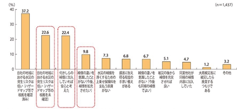 一方、保険や共済に加入している企業はどうでしょうか。一言でいうと、被害を想定して加入しているわけではありません。具体的に見てみましょう。『水災被害への補償内容が「一部割合の補償」、「水災補償なし」の商品に加入した理由』の中からポイントを拾います。「自社の地域における水災の発生リスクは低い(ハザードマップ等の根拠を未確認)」、「何かしらの補償に加入していれば安心と考えた」、「補償の違いを意識したことがない(今後、補償を拡充させたい)」といった理由が上位に入り、保険等に加入していても被害を想定し、補償内容を吟味していないということが浮き彫りになっています。