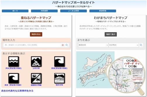 ハザードマップは、主に自治体の窓口で配布されていますが、「ハザードマップポータルサイト」(