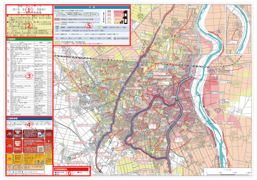 ハザードマップ内の各種情報について、赤四角で囲って番号を振りましたので、その番号にそって記載内容をご説明します。