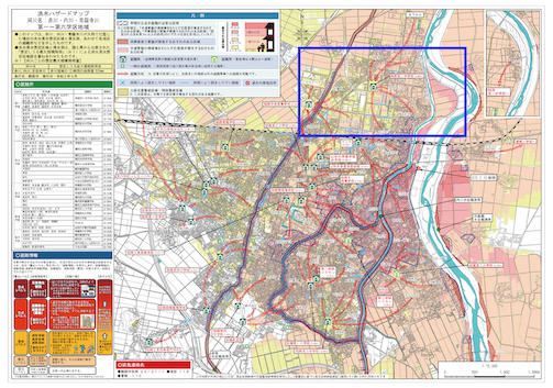 本ハザードマップが対象としている地域、氾濫が想定される河川、浸水想定区域・浸水深、流域の最大想定雨量等が記載されています。