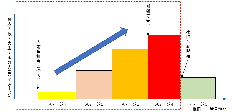 水害・土砂災害は、降雨量等の気象状況に応じて想定される状況が移り変わります。状況の進展に応じて、起こりうる状況を想定しておくことが災害時の行動に有効です。