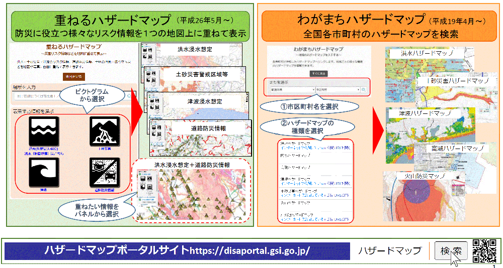 国土交通省で公開している、①重ねるハザードマップや、②わがまちハザードマップを活用して、自拠点の「浸水リスク」、「土砂災リスク」、「津波浸水リスク」を確認できます。