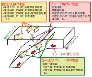 地震には、海側のプレートが陸側のプレートの下に潜り込むときに起きる地震(海溝型)と過去に地震が発生しこれからも活動すると考えられている活断層による地震(直下型)があります。