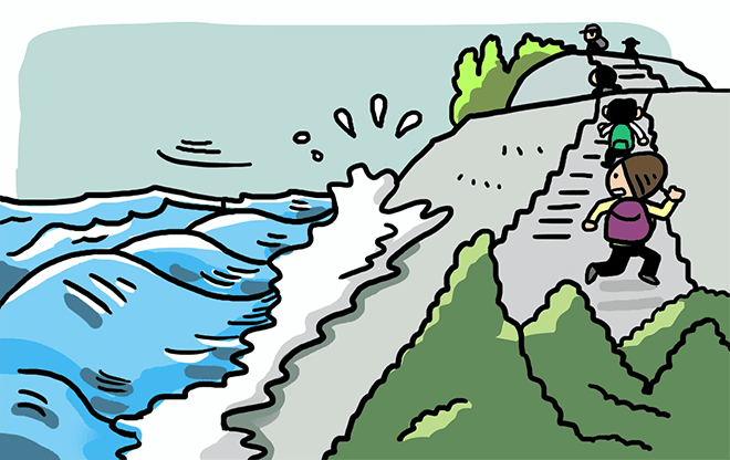津波は猛スピードで迫って来ます。海岸に到達したのを見てから逃げたのでは間に合いません。強い地震を感じた時や、弱くても長い時間ゆっくりとした揺れを感じた時は、直ちに海岸から離れた高台や高いビルの上層階などに避難しなければなりません。