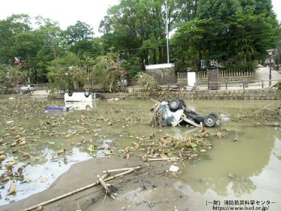 図表 令和2年7月豪雨 井阿蘇神社の蓮池に水没した車