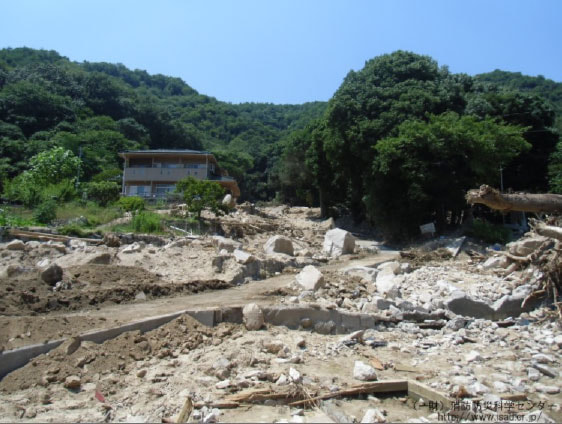 この大雨では、全国で2,500件を超える土砂災害が発生し、死傷者は230名以上に及ぶ被害が生じました。特に広島県内においては20市町で484箇所の土砂災害が発生し、死者・行方不明者は100名以上に及ぶ被害が生じました。また、94河川で破堤・越水が起き、県全域にまたがるライフラインへの被害、線路敷の流失など鉄道への被害や道路損壊も発生し、交通ネットワークが多数被災したため、操業不能(一部操業:64社、操業不能:82社)になる企業も続出しました。
