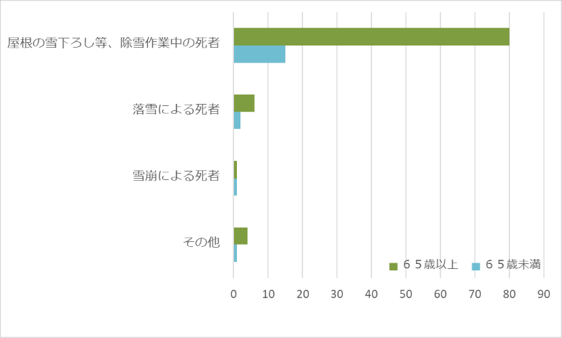 これによると屋根の雪下ろし等、除雪作業中に亡くなられる方が群を抜いております。特に65歳以上の高齢者の割合が高く、毎年雪害による死者全体の7~8割を占めています。