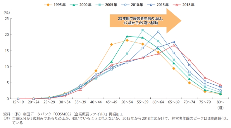 一方、事業承継に係る問題としては、年々進む経営者の高齢化という現実があります。図表1を見ると、1995年当時47歳だった中小企業経営者の年齢のピークが毎年1歳ずつ上がり、現在は70歳に到達しており、事業承継か廃業かの瀬戸際に立っていることがわかります。