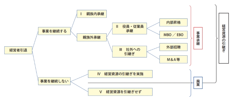 経営者の引退の道は、図表2のように図示することができます。もちろん事業を承継し、継続することが本筋です。中小企業において事業承継の道としては、後継者として適任者がいれば親族内への承継が一般的ですが、いなければ自社の役員や従業員の中から適任者を選び承継することとなります。