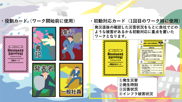 中小機構では、令和6年度、全国10カ所でジギョケイの認定を受けた事業者を対象にして、このカードゲームを使ったワークショップを開催しました。その時に使用したカードゲームの印刷原稿や、ワークショップで使用する教材一式を、中小企業強靱化ポータルの専用ページに掲載しています。カードゲームは、主に水害・地震を題材にしており、発災直後の状況が書かれた「初動カード」、発災翌日の状況が書かれた「災害カード」、災害カードと一緒に引く「インフラカード」、そしてディスカッションの役割を決めるために「役割カード」から構成されています。詳細は